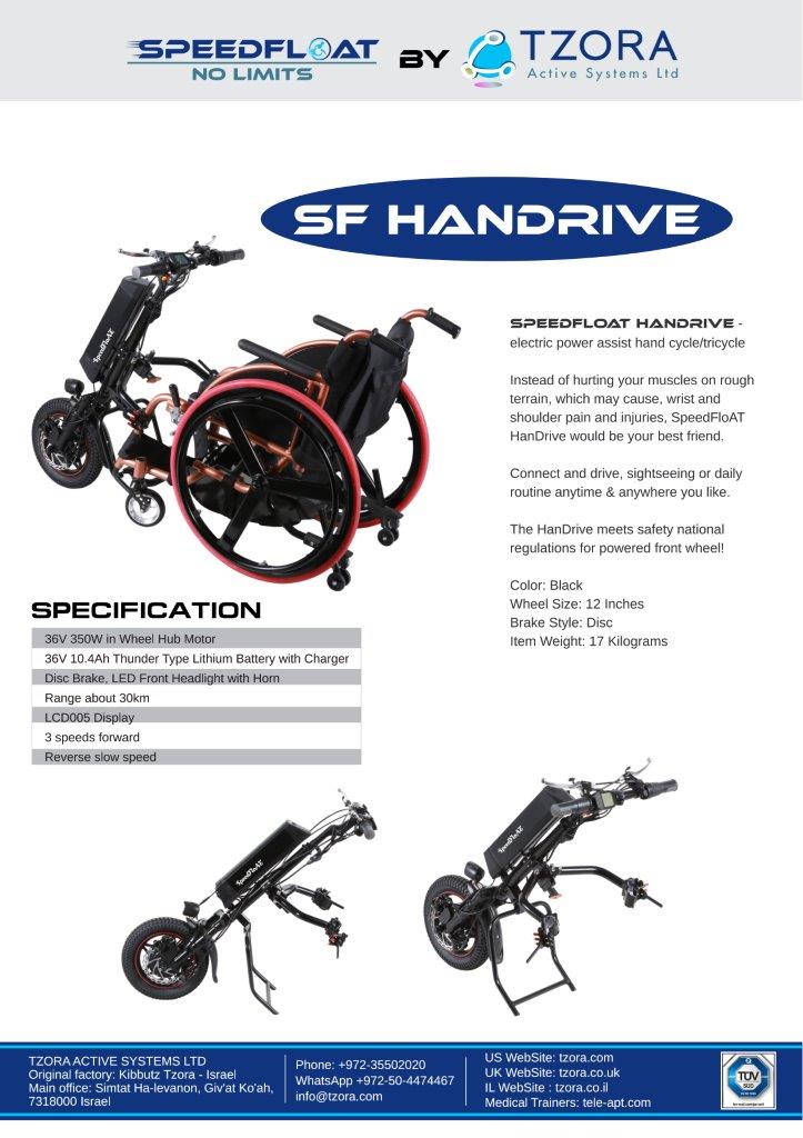 כידון חדשני ההופך בקלות כל כסא ידני לכסא ממונע. תלת אופן ממונע חזק ואמין ישירות מכסא הגלגלים הקבוע של המשתמש צבע שחור ובלמי דיסק. במקום לפגוע בשרירים היעזרו בכידון ממונע והמנעו מסכנת פציעות בשורש כף היד ומכאבי כתף HanDrive SpeedFloAT יהיה החבר הכי טוב שלך.